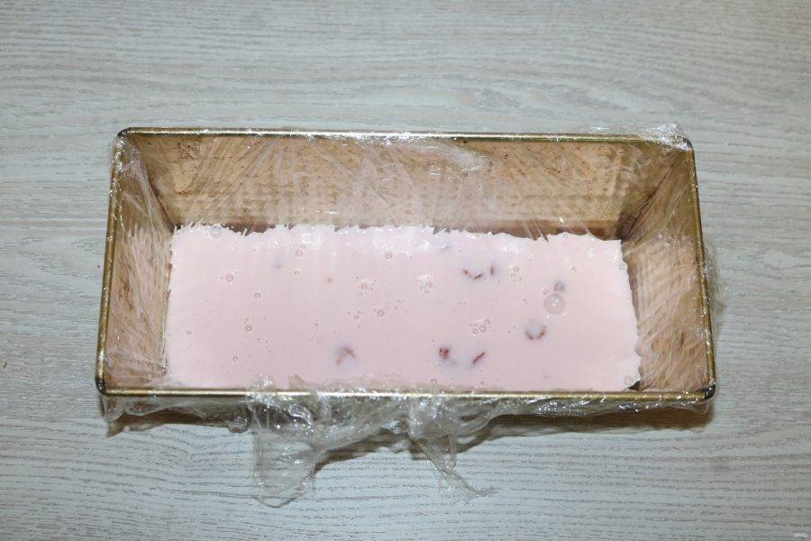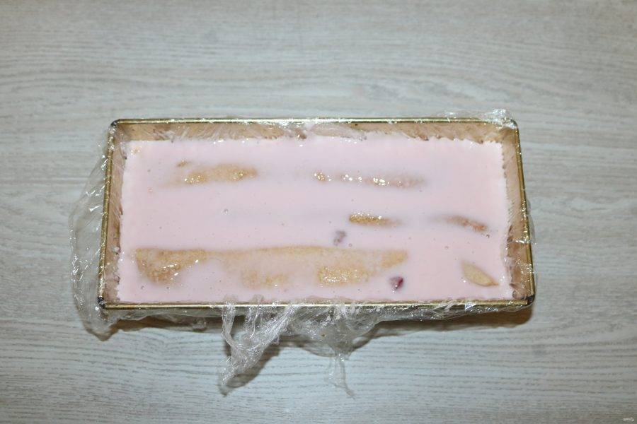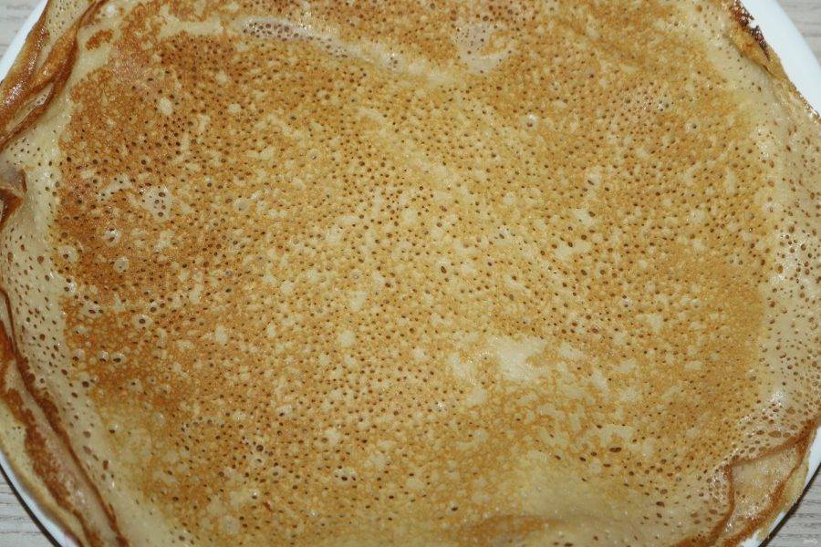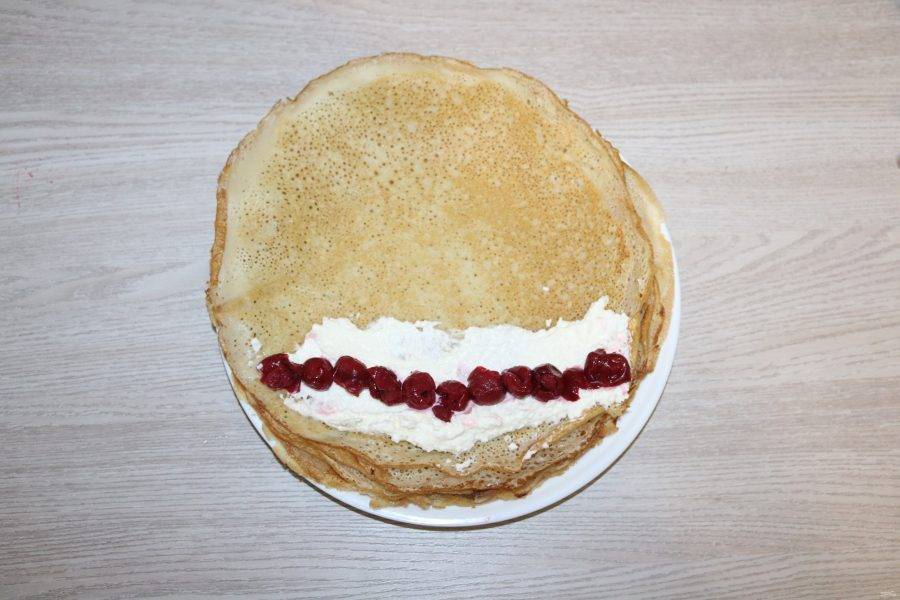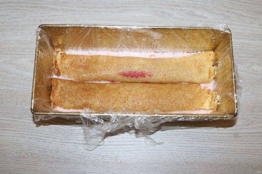 Повторите ещё слой блинчиков и залейте заливкой. Поставьте в холодильник для застывания на 2-3 часа.