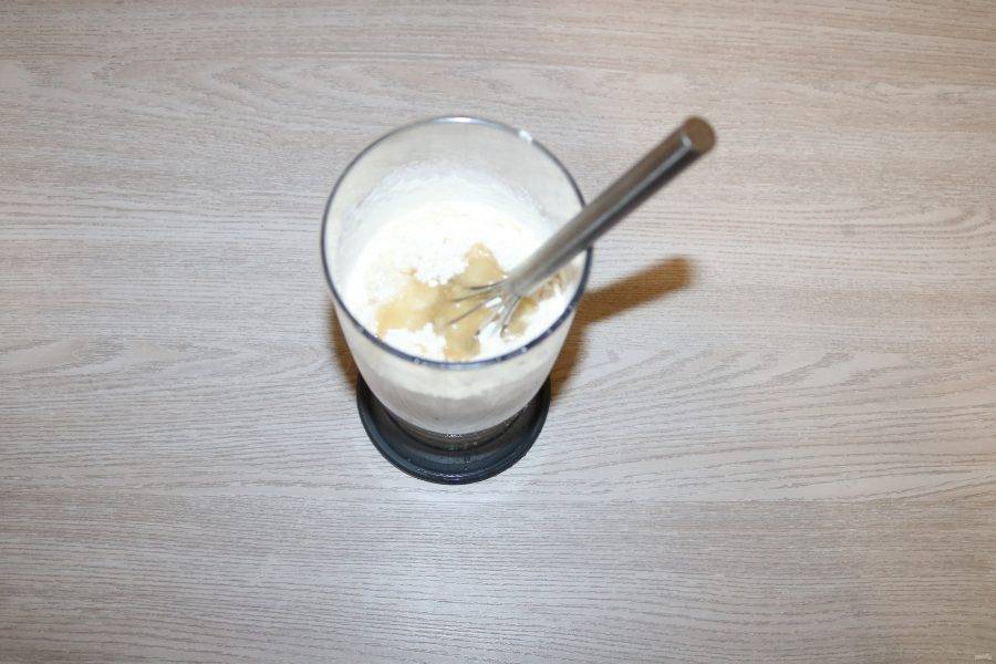 В жидкий йогурт добавьте сахар по вкусу, выделившийся от вишни сок и желатин. Хорошо перемешайте.