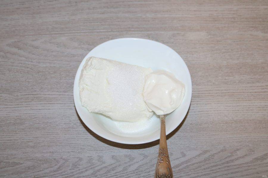 Подготовьте творожную начинку. Смешайте творог с сахаром и ложкой сметаны.