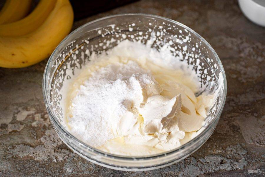 Добавьте ко взбитым сливкам сливочный сыр и сахарную пудру.