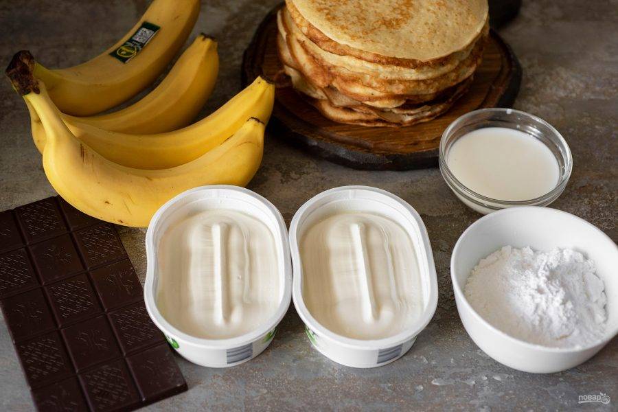 Подготовьте все ингредиенты для приготовления крем-чиза, шоколадной глазури. Также подготовьте бананы для фруктовой прослойки.
