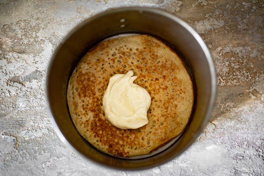 На дно разъемной формы (у меня форма диаметром 16 см.) выложите пергамент для выпекания и приступайте к сборке блинного тортика — положите первый блинчик, а поверх распределите слоем 2-3 столовые ложки крем-чиза.