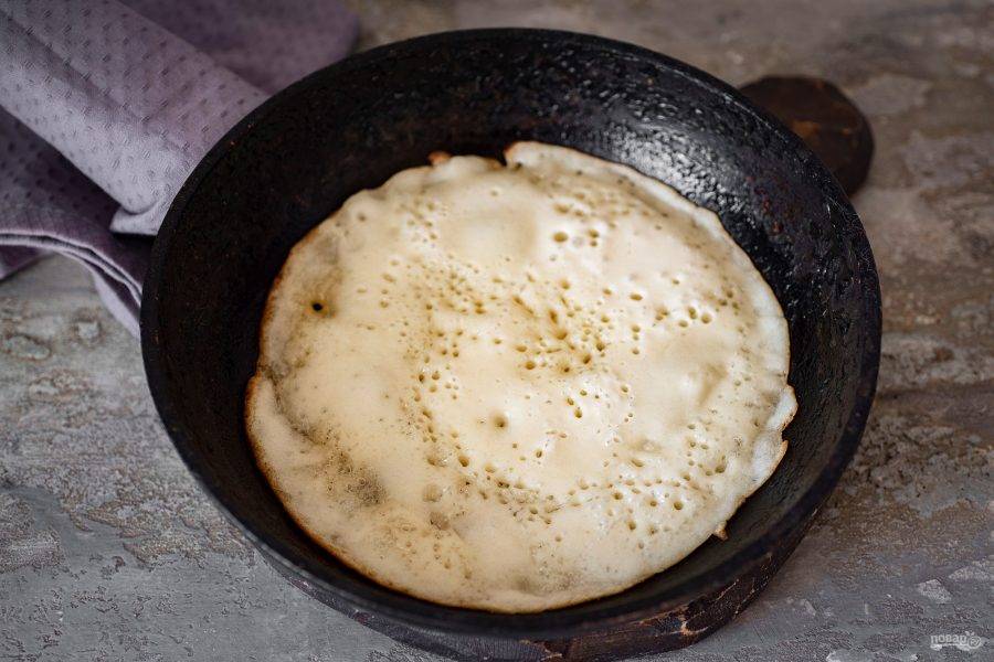 Смажьте сковороду растительным маслом и выпекайте блинчики с двух сторон до появления золотистого оттенка.