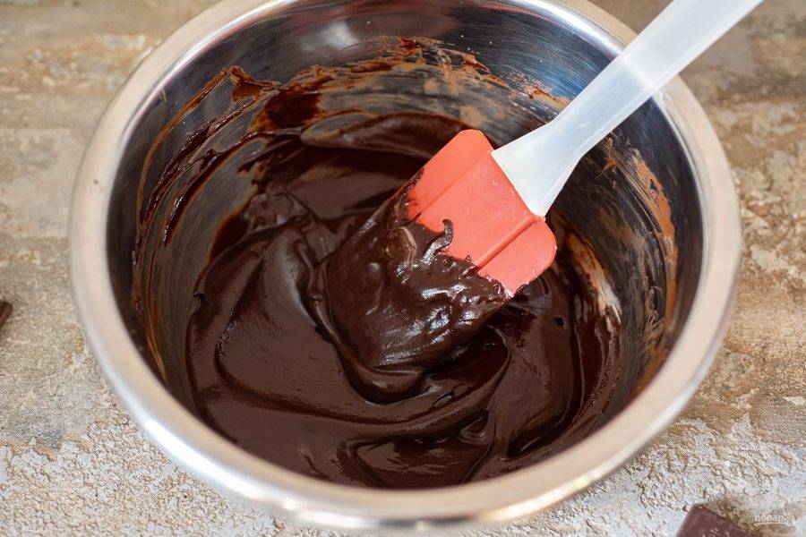 На водяной бане растопите шоколад со сливками, активно помешивая кулинарной лопаткой — должна получиться однородная, гладкая шоколадная смесь.