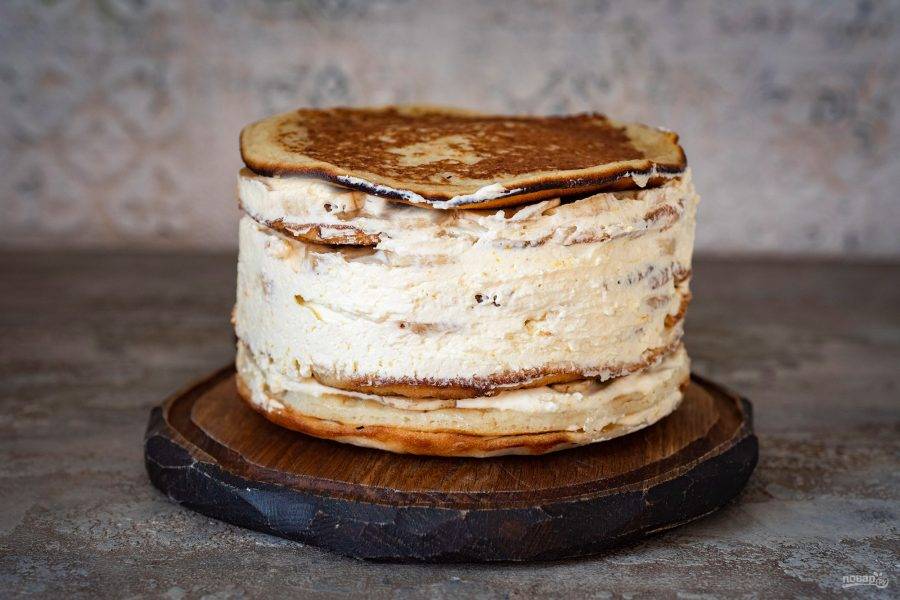 Выложите поверх кремового слоя тонкие кружочки очищенного банана слоем. Так выкладывайте по очереди поверх блинчик, слой крема и слой бананов. Последним слоем у тортика будет просто блинчик. Для торта мне понадобилось 7 толстых блинчиков диаметром 16 см. Форму с собранным тортиком отправьте в холодильник минимум на 4 часа, а лучше на ночь.