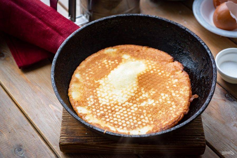 Разогрейте сковороду, смажьте тонким слоем растительного масла, выложите порцию теста и распределите по сковороде равномерно. Блинчик обжарьте с двух сторон до золотистого румянца.