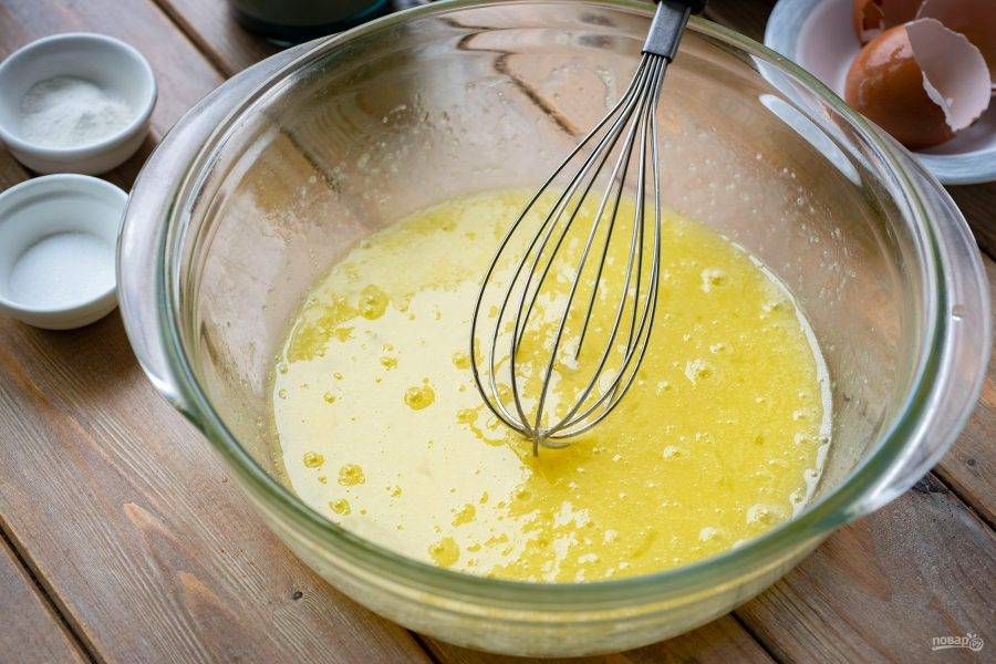 В миску вбейте яйца, залейте растительное масло, добавьте соль и сахар.