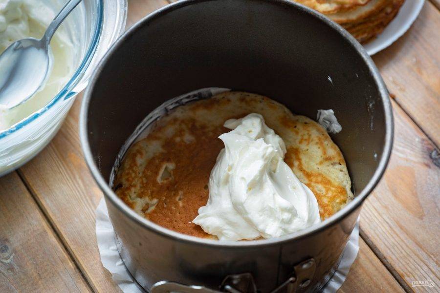 Приступайте к сборке тортика. На дно формы выложите пергамент для выпекания, поверх выложите блинчик, затем выложите 2-3 столовые ложки крема и распределите равномерно, поверх опять выложите блинчик.