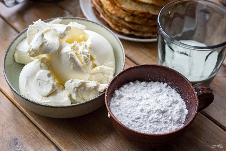 Жирные сливки залейте в миску и взбейте их миксером до мягких пиков. Добавьте ко взбитым сливкам сливочный крем и сахарную пудру.