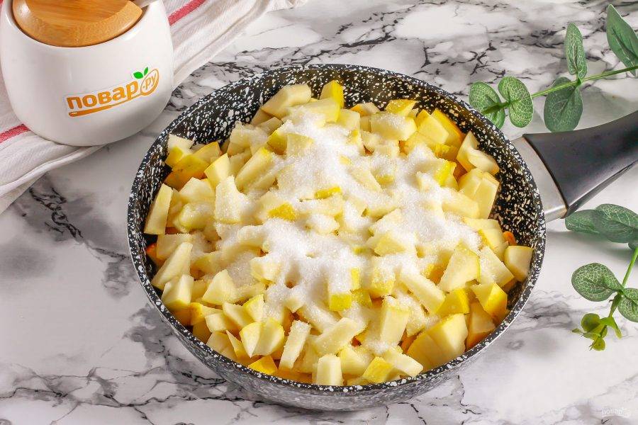 Промойте яблоки любого сорта и разрежьте их пополам, удаляя семенные блоки. Если фрукты кислые, то добавьте чуть больше сахара. Нарежьте яблочную мякоть мелкими кубиками и выложите ее в казан или сковороду с высокими бортиками. Всыпьте сахарный песок, молотую корицу и перемешайте.