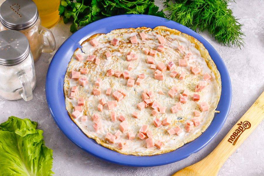 Выложите блин на тарелку и смажьте его сметаной любой жирности либо майонезом. Нарежьте ветчину мелкими кубиками, а сыр натрите на терке с мелкими ячейками. Выложите на сметану часть нарезки ветчины.