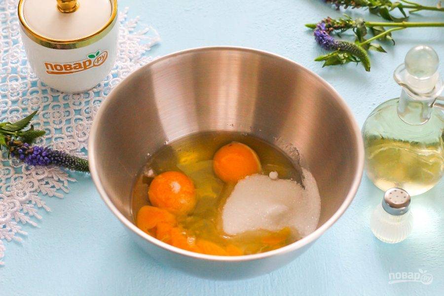 Для приготовления блинов куриные яйца вбейте в глубокую емкость, всыпьте сахар и соль. Аккуратно удалите 2-3 желтка и отложите в сторону, они вам потребуются для крема. Оставшиеся желтки и белки взбейте с сахаром примерно 3-4 минуты при помощи венчика.