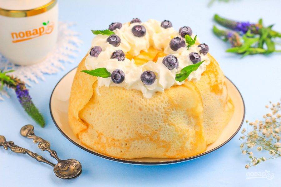 Накройте еще блином и прижмите его к крему, добавьте еще порцию крема и так же разровняйте. Накройте еще блином и т.д., пока не соберете весь торт. Если блины очень тонкие, то выкладывайте по 2 шт. Сверху выложите 2 блина и заверните свисающие блины внутрь емкости. Поместите емкость на холод примерно на 1 час.