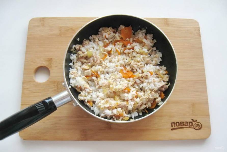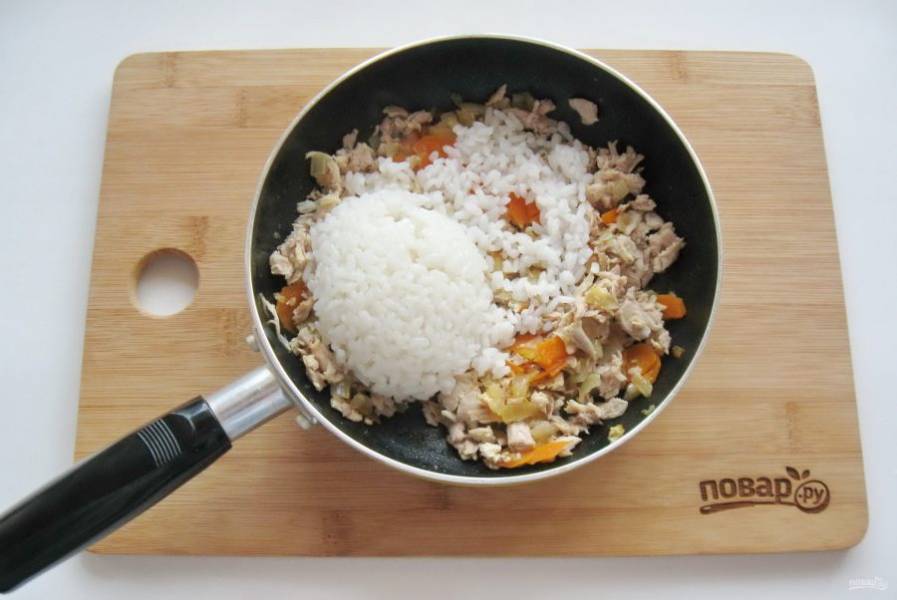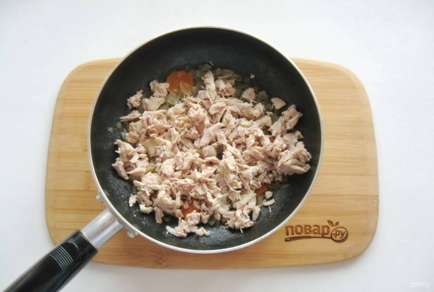 Любое отварное мясо мелко нарежьте и добавьте в сковороду к луку и моркови.