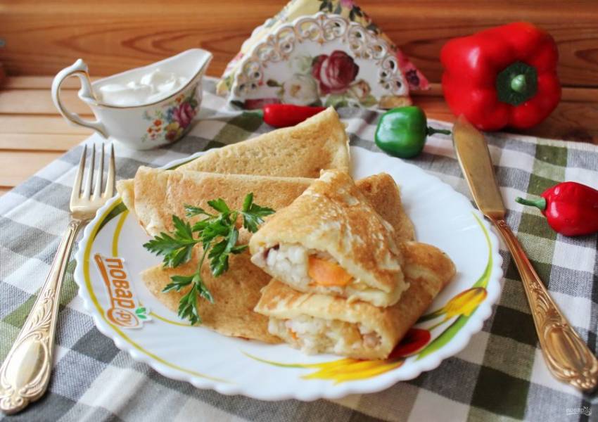 Блины-пирожки очень удобны тем, что готовятся сразу с начинкой. Они имеют форму сложенного блина, а по содержанию похожи на пирожок с начинкой.