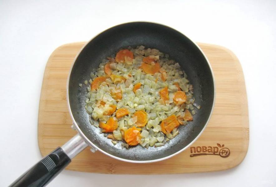 Пока тесто подходит, приготовьте начинку для блинов-пирожков. Морковь и лук очистите, помойте и нарежьте. Выложите в сковороду.