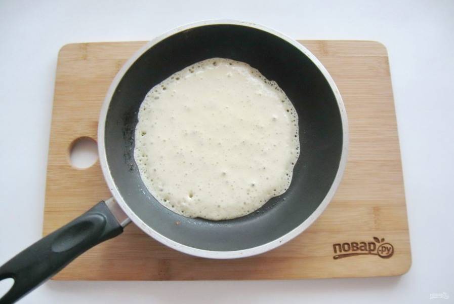 Подождите пока поверхность теста покроется пузырьками и слегка поджарится. Выложите две столовые ложки начинки на одну сторону блина.