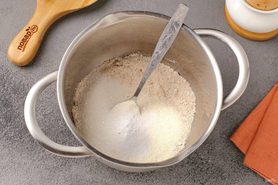 Добавьте к перемолотым хлопьям манку, сахар, соль и соду.