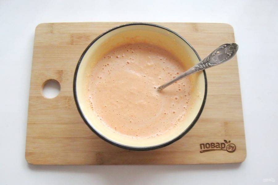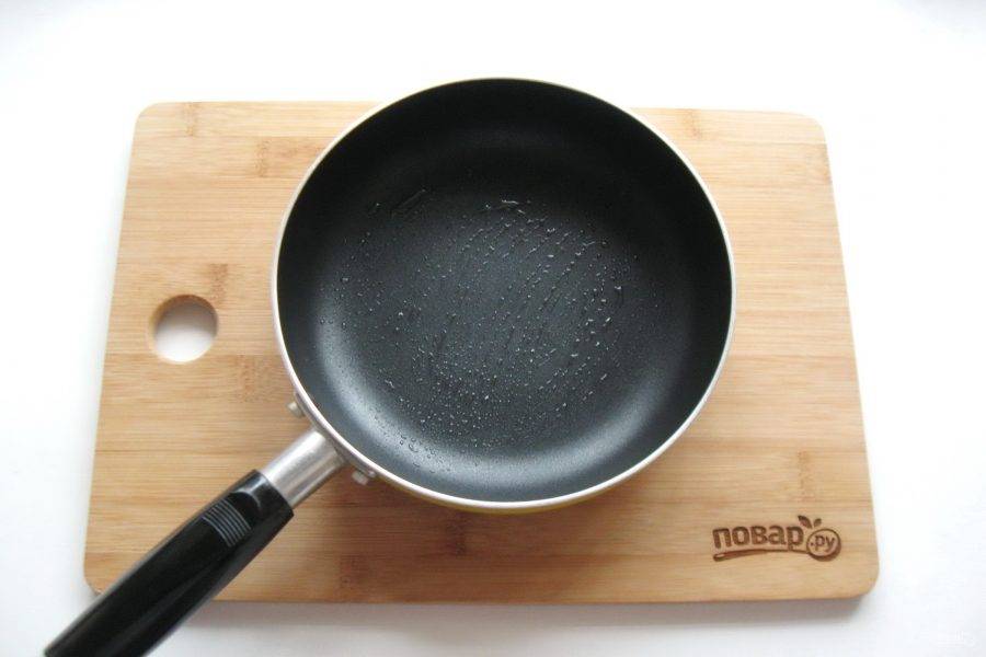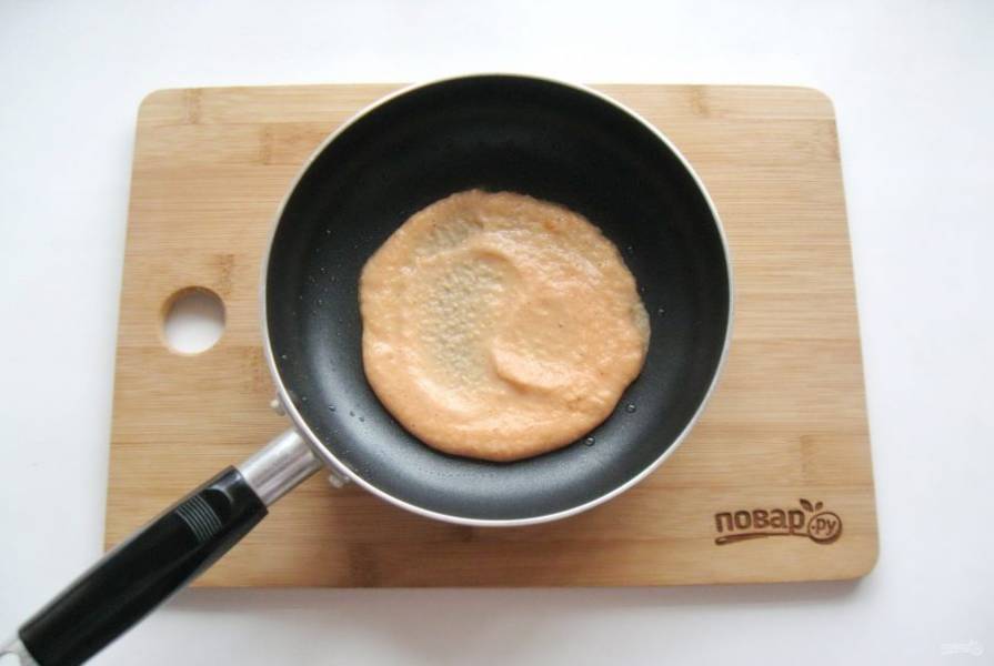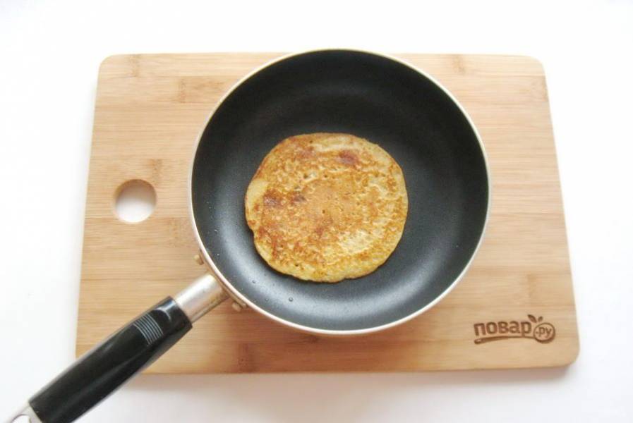 Выложите две столовые ложки теста. Круговыми движениями разровняйте его по сковороде. Диаметр блина должен быть 11-12 см. Обжаривайте блин с одной стороны 1,5 минуты, пока поверхность блина не станет матовой и не подсохнет.