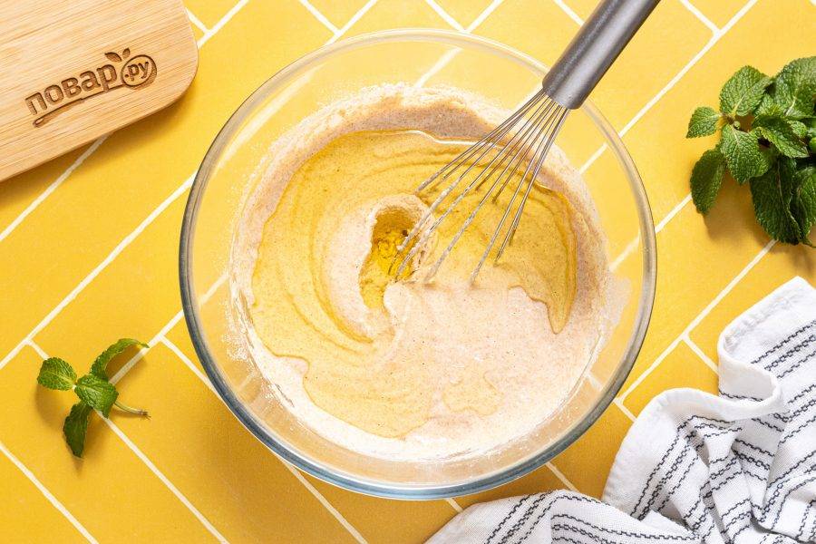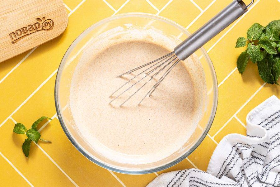 Все перемешайте до однородности венчиком. По консистенции должно получиться чуть гуще обычного теста для блинов. По необходимости можно добавить еще молока или воды.
