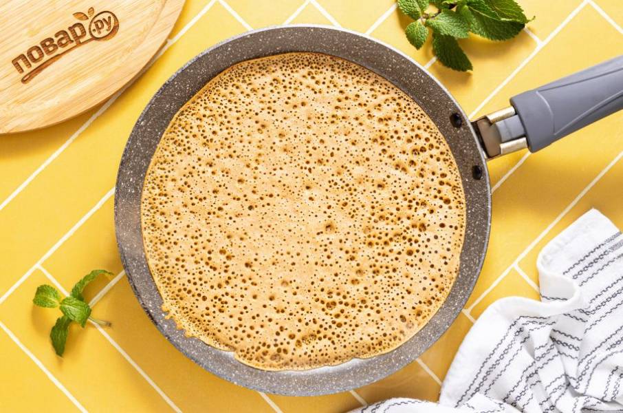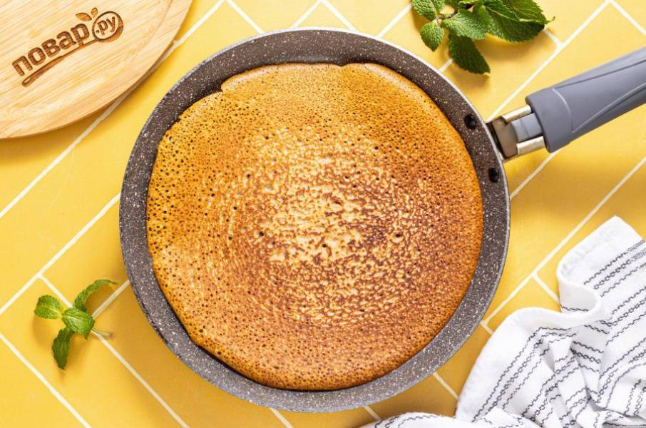 Хорошо разогрейте сковороду, слегка смажьте растительным маслом в первый раз, а затем выпекайте на сухой сковороде. Влейте столько теста, чтобы оно равномерно распределилось тонким слоем по диаметру сковороды. Выпекайте до золотистого цвета.