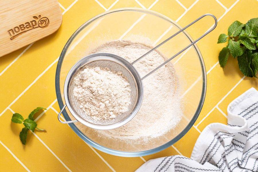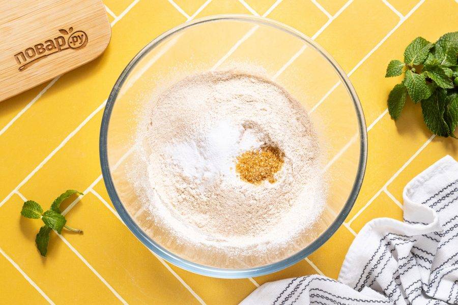 Добавьте сахар, щепотку соли и соду. Перемешайте венчиком.