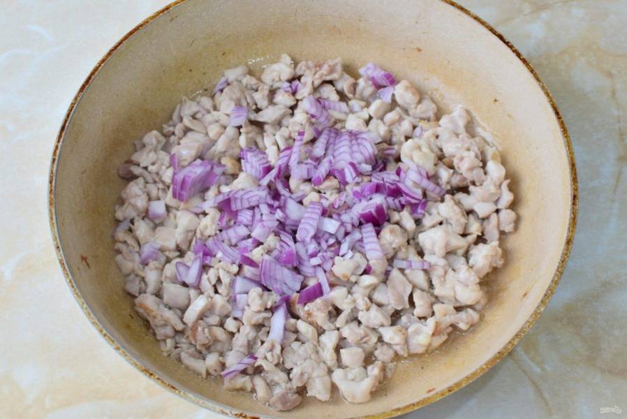 Для приготовления начинки мелко нарежьте курицу и обжарьте её в течение 10-12 минут. Затем добавьте мелко нарезанный красный лук. Обжаривайте курицу с луком еще 2-3 минуты.