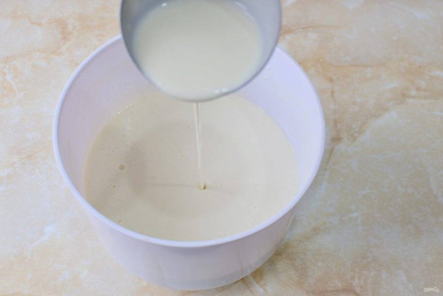 Влейте растительное масло и молоко. Подсыпайте муку и замешивайте тесто.