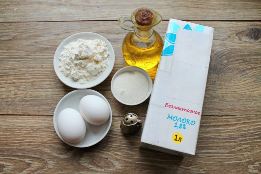 Подготовьте все необходимые ингредиенты для приготовления блинов на безлактозном молоке.
