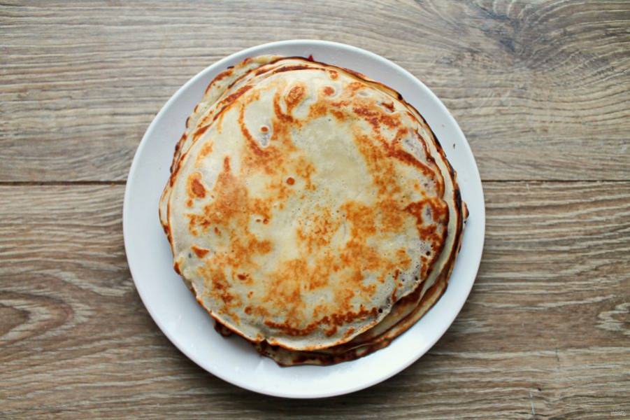 Испеките так все блины, складывая их в стопку и покрывая колпаком, чтобы оставались горячими.