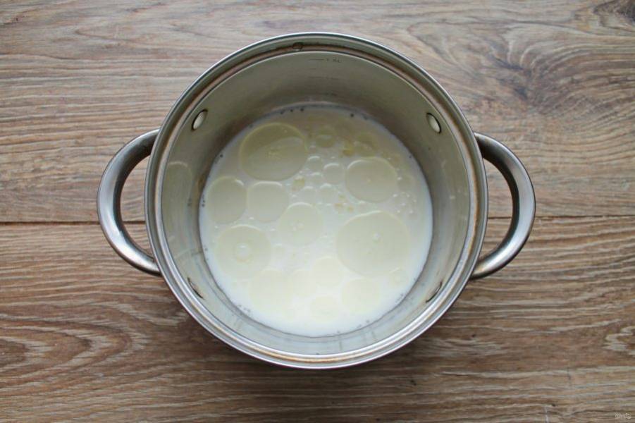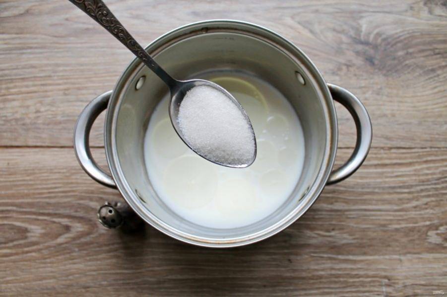 Всыпьте в молоко соль и сахар, перемешайте до растворения крупинок.