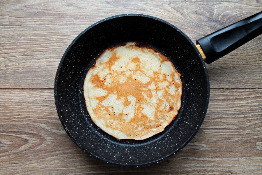 Сковороду смажьте растительным маслом и разогрейте на среднем огне. Налейте в сковороду тесто и быстро распределите его по дну тонким слоем. Обжаривайте блин 1-2 минуты до румяного цвета. Переверните и обжарьте другую сторону.