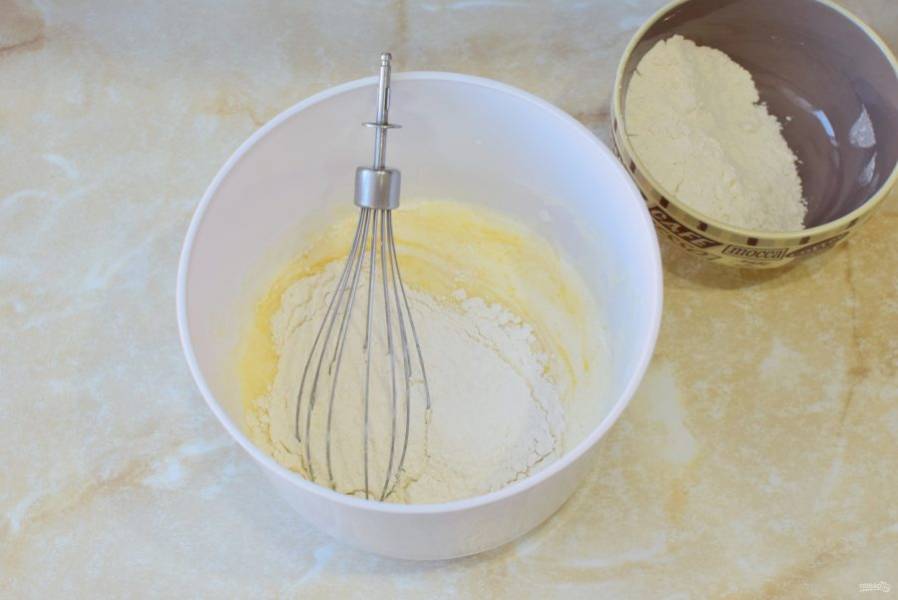 Постепенно подсыпая муку, вмешивайте её в тесто. На этом этапе тесто будет достаточно густое.
