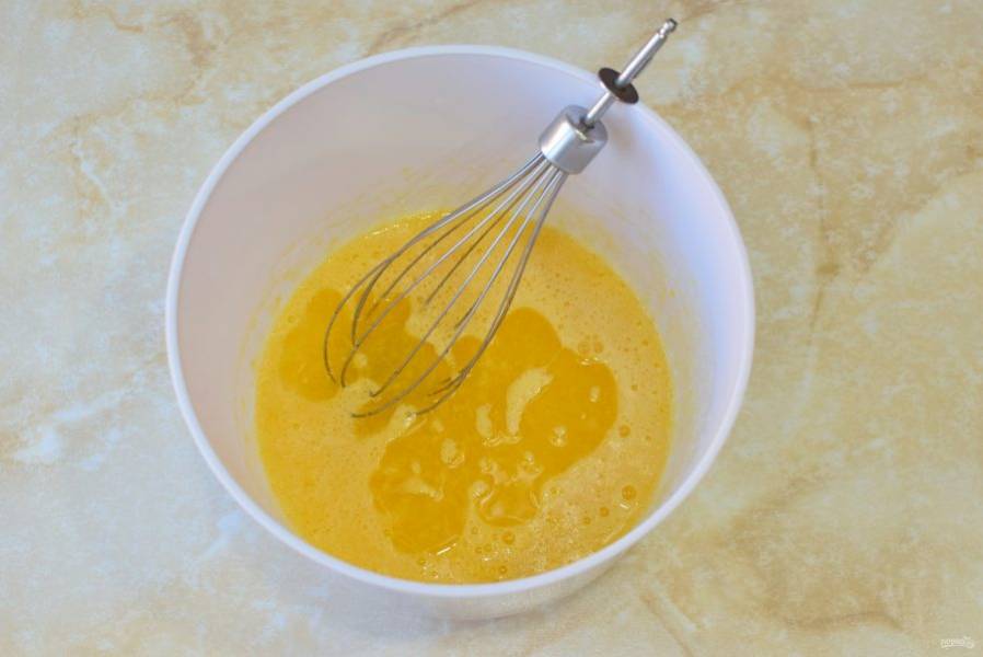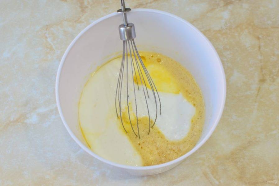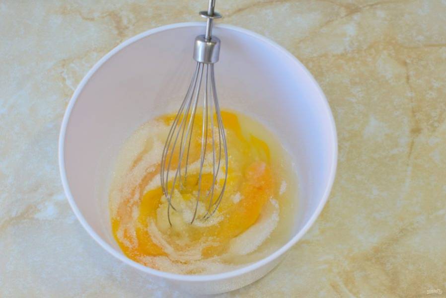 В чашу налейте кефир и добавьте яйца. Всыпьте сахар.