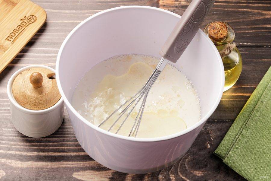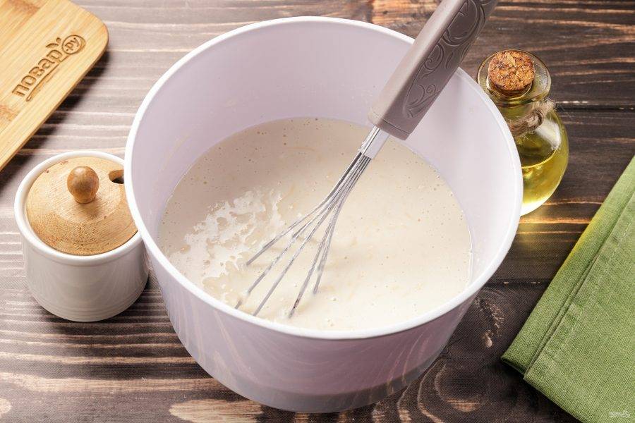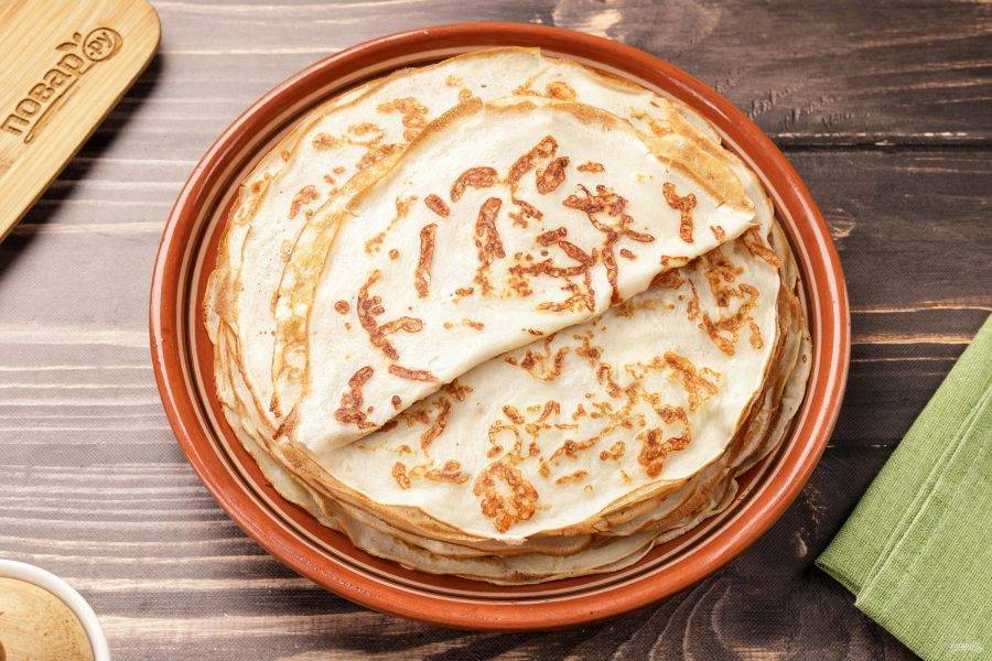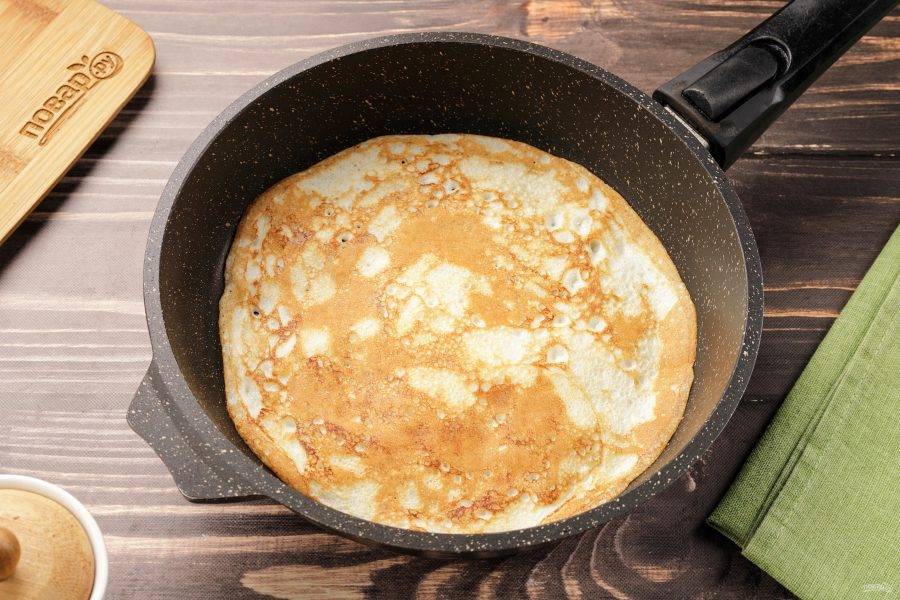 Сковороду хорошо разогрейте, смажьте растительным маслом и налейте порцию теста. Как только тесто схватится, переверните блинчик.