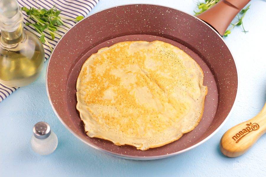 Прогрейте сковороду на плите и смажьте первый раз ее дно маслом. Влейте половину половника теста и округлите. Обжарьте 1-2 минуты и переверните на другую сторону, блины получаются пузырчатыми, кружевными с одной стороны. Имейте в виду ,что они очень мягкие, поэтому переворачивайте аккуратно.