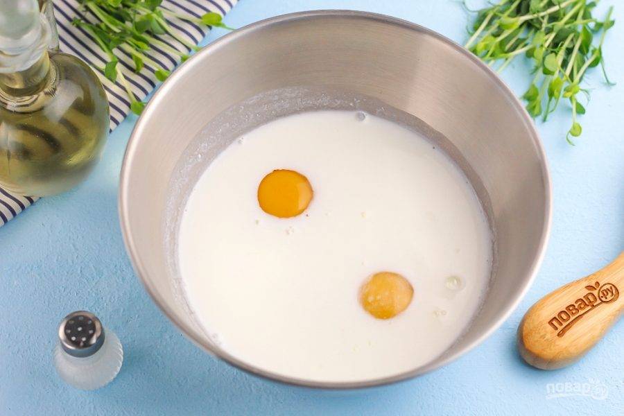 Всыпьте сахар и соль, тщательно перемешайте, чтобы они растворились. Вбейте куриные яйца, влейте воду и взбейте все венчиком сразу же, пока яйца не свернулись.