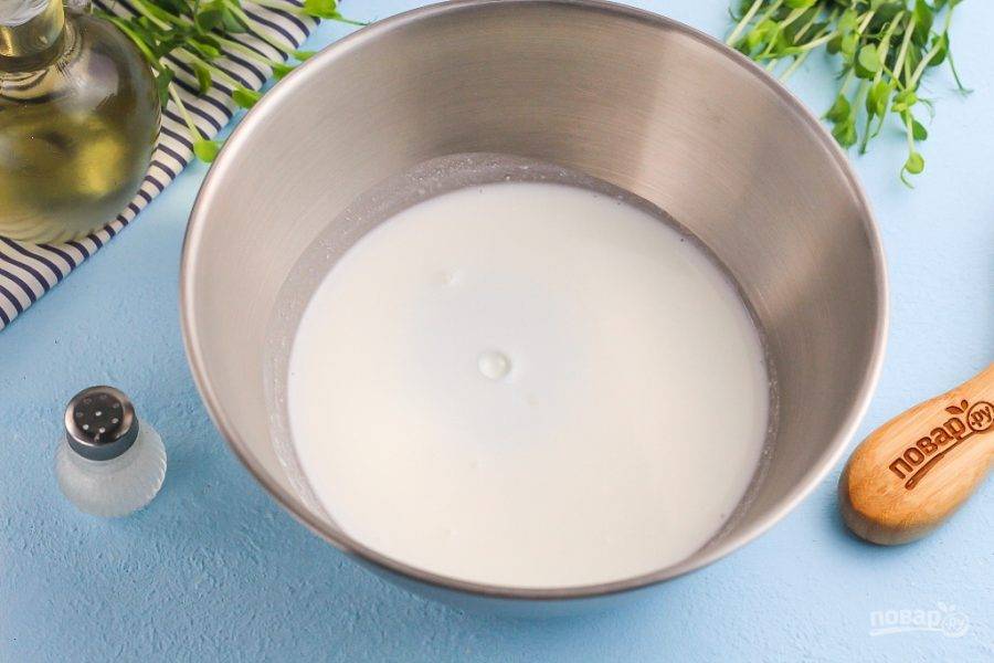 Кефир влейте в сотейник, ковш или металлическую миску с высокими бортиками. Поместите емкость на плиту и прогрейте примерно до 60 градусов, время от времени помешивая, чтобы он не свернулся. Выключите нагрев и вмешайте соду — она сразу же образует в напитке крупные пузыри.