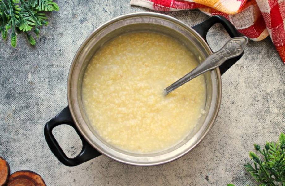 Пшено промойте до чистой воды и выложите в кастрюлю с толстым дном. Влейте воду, немного посолите и отварите на медленном огне под крышкой до готовности. Пшено должно развариться, на это уйдет примерно 20-25 минут. Кашу снимите с огня и остудите.