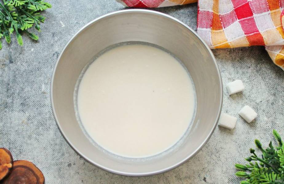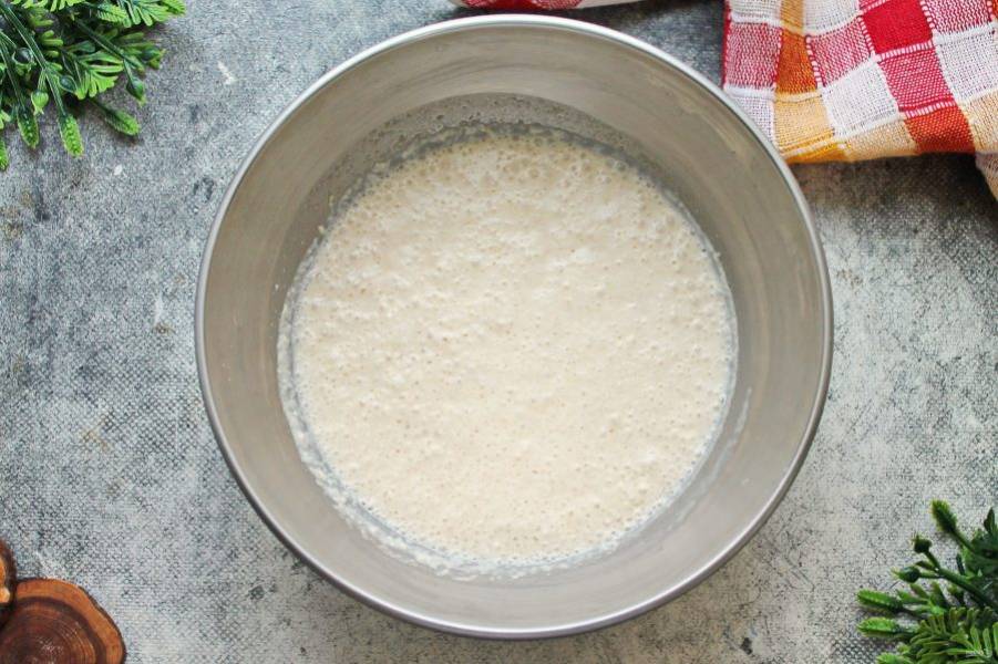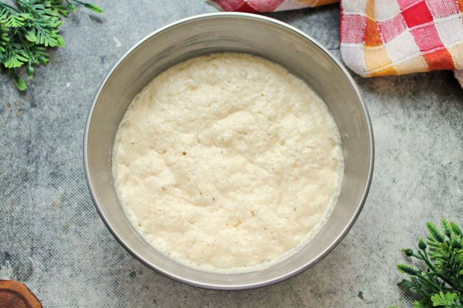 Миску накройте и уберите ее в тепло на 15-20 минут, чтобы дрожжи начали работать, и получилась опара.