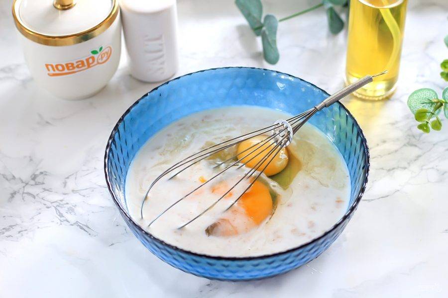 Вбейте куриные яйца и взбейте содержимое емкости примерно 2-3 минуты.