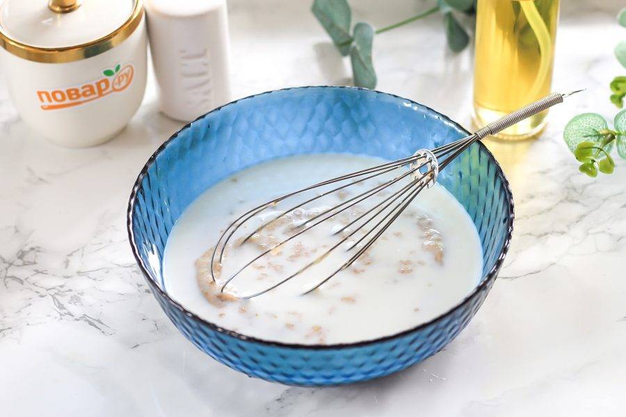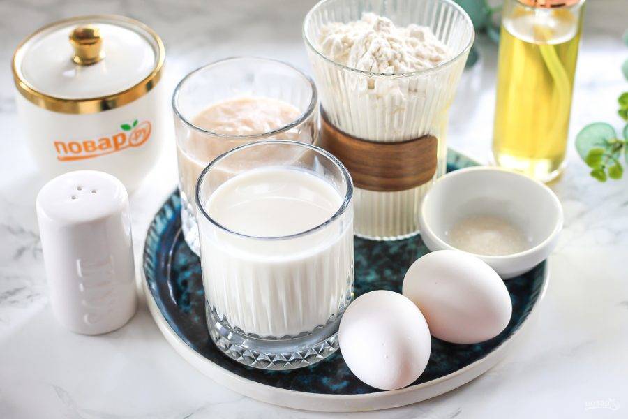 Подготовьте указанные ингредиенты. Лучше всего готовить на молодой закваске, она не так горчит на вкус. Если закваски будет больше, чем молока, то блины будут чуть темнее на вид.