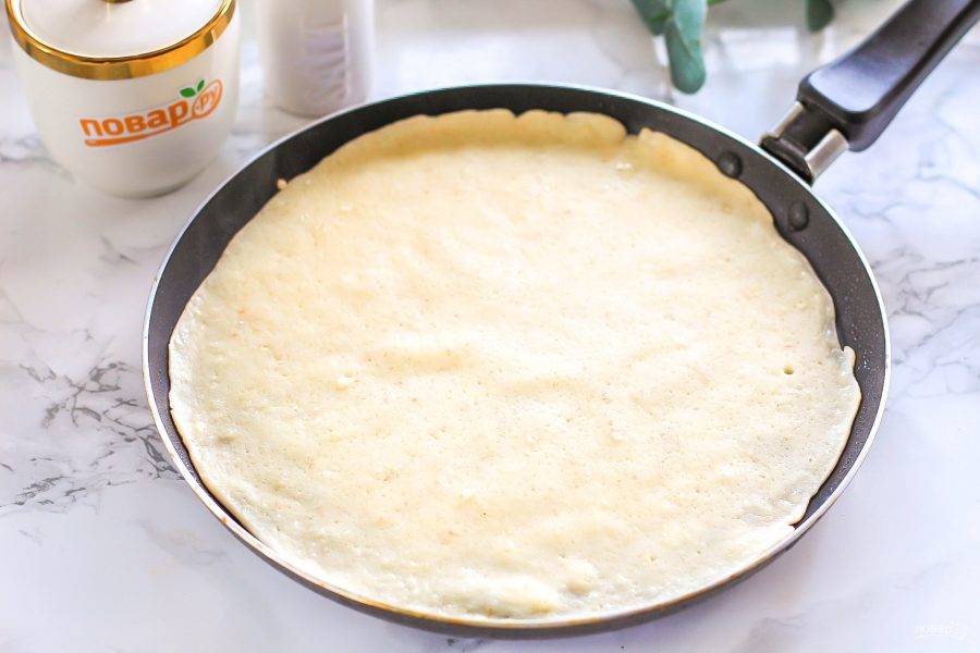 Разогрейте сковороду и смажьте ее растительным маслом. Влейте половину половника теста и округлите его на сковороде. Обжарьте с одной стороны 1-2 минуты.