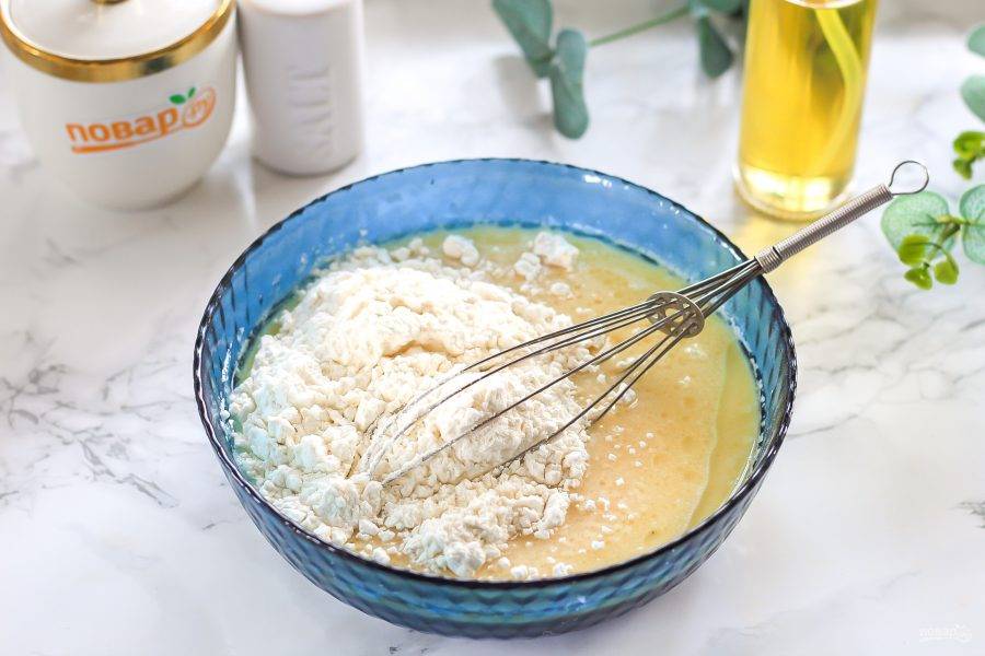 Влейте растительное масло, всыпьте пшеничную муку и вмешайте их в массу. Оставьте тесто в покое на 1 час при комнатной температуре.