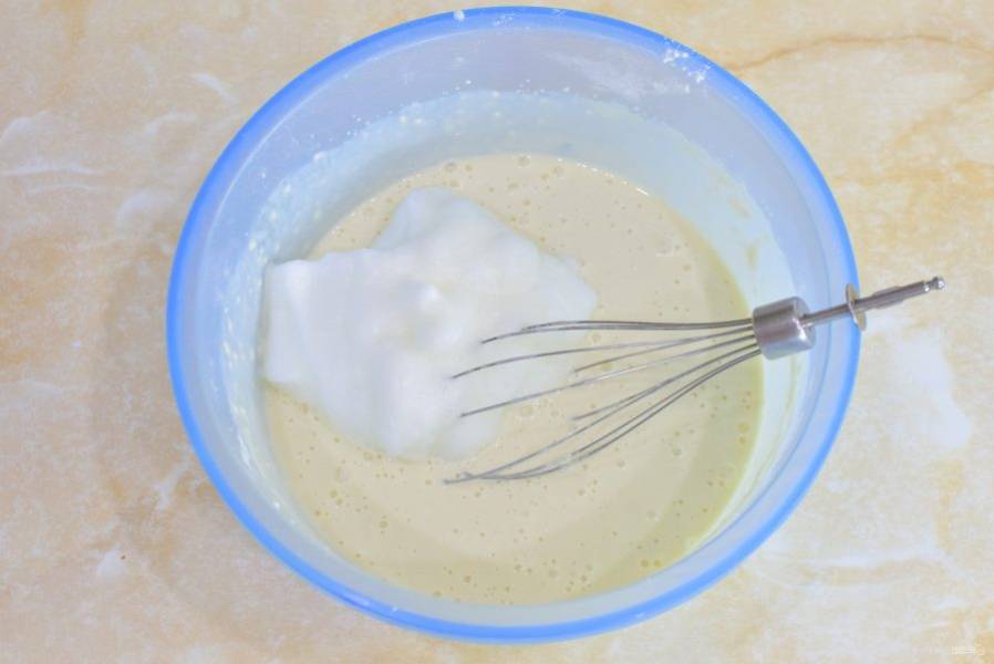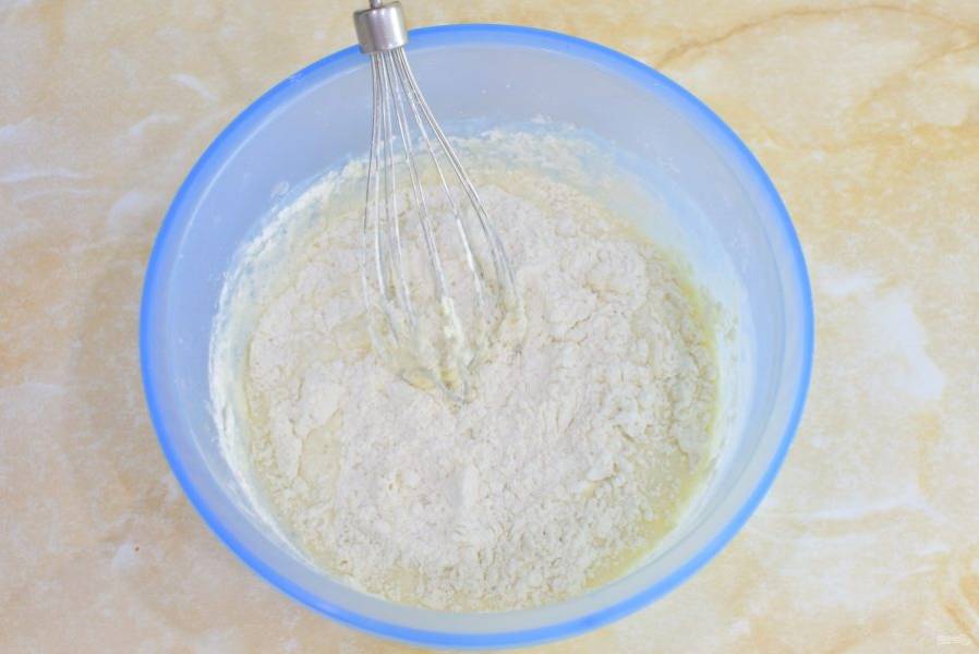 К тесту постепенно подсыпайте просеянную муку и сразу перемешивайте.