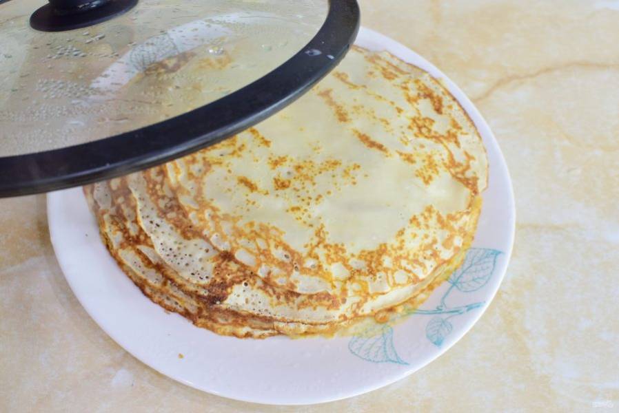 Готовые блинчики складывайте друг на друга и накрывайте крышкой, чтобы они не высыхали.