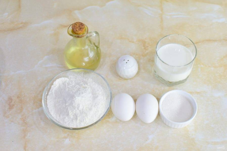 Для приготовления блинов подготовьте необходимые ингредиенты. Муку заранее просейте через сито, чтобы насытить её кислородом.