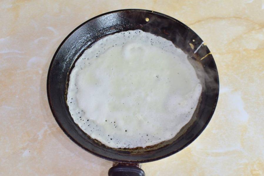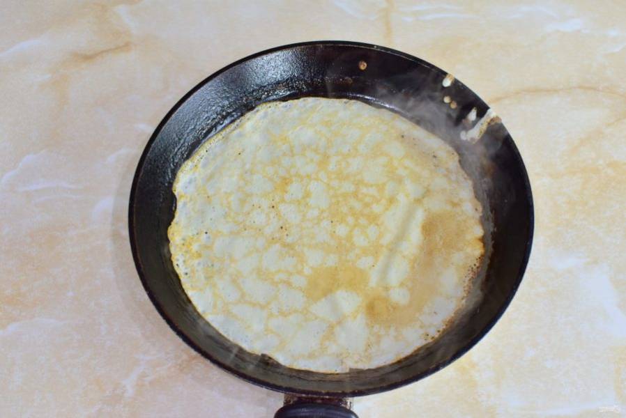 Готовьте блинчики с двух сторон на небольшом огне до золотистого цвета.