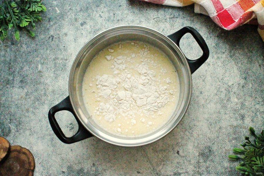 Муку соедините с разрыхлителем и просейте в молочную смесь. Все хорошо перемешайте, чтобы не было комочков.