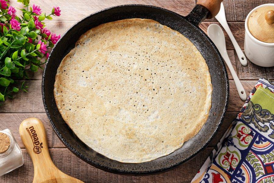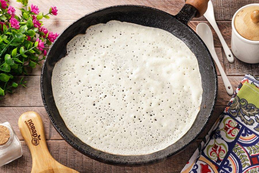 Сковороду хорошо разогрейте и смажьте маслом. Налейте половником тесто и равномерно распределите его по всей сковороде.